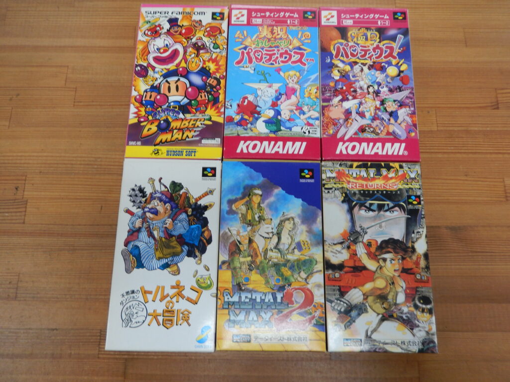 今回買取したのは、画像の「スーパーボンバーマン」「実況おしゃべりパロディウス」「極上パロディウス」「トルネコの大冒険」「メタルマックス2」「メタルマックスリターンズ」や、その他にも20本ほどお売り頂きました。